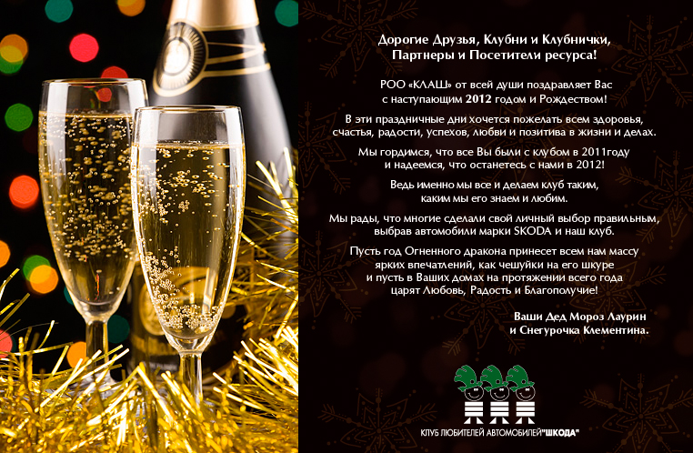 | Дорогие Друзья, Клубни и Клубнички, Партнеры и Посетители ресурса!РОО "КЛАШ" от всей души поздравляет вас с наступающим 2012 годом и Рождеством!В эти предпраздничные дни хочется пожелать всем здоровья, счастья, радости, успехов, любви и позитива в жизни и делах.Мы гордимся, что все Вы были с клубом в 2011 и надеемся, что останетесь с ним в 2012.Ведь именно мы все и делаем клуб таким, каким мы его знаем.Мы рады, что многие сделали свой личный выбор правильным, выбрав автомобили марки Skoda и наш клуб.Пусть год Огненного дракона принесет всем нам массу ярких впечатлений, как чешуйки на его шкуре и пусть в Ваших домах на протяжении всего года царят Любовь, Радость и Благополучие! Ваши Дед Мороз Лаурин и Снегурочка Клементина |